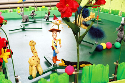 eine schwankende Spielfläche, die Bälle in Bewegung setzt, diese wiederum Figuren und Blumen zum drehen und schwanken bringen